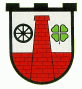 „In silbernem Schild auf einer roten Mauer ein roter Rauchfang wachsend, begleitet von einem Schwarzen Rad (vorne) und einem grünen vierblättrigen Kleeblatt (hinten).“